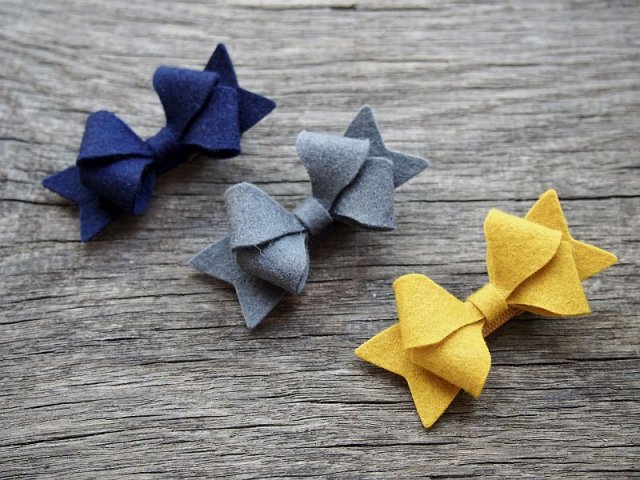 Spinki do włosów kokardki z filcu. Komplet 3 sztuki Dla dużych i małych dziewczynek z bujną czuprynką. Lekkie, dobrze trzymają się na włosach. Wielkość kokardki 3,5cm x 6 cm Spinka typu klips 4,5 cm .