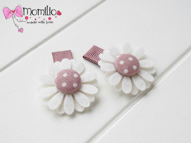 Kwiatuszki z filcu merino ozdobione ręcznie zrobionym guziczkiem