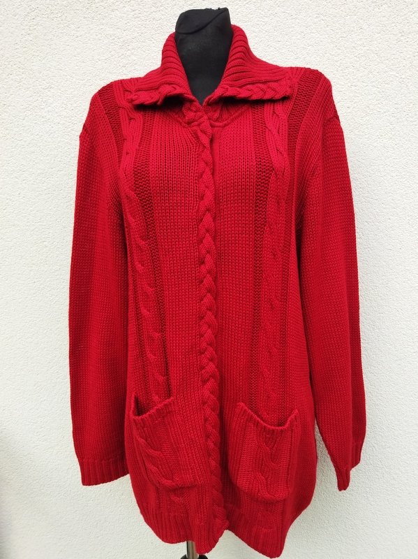Dobrej jakości sweter z wełniano -akrylowej włóczki w kolorze jarzębinowej czerwieni zdobiony warkoczowymi wzorami. Z kołnierzem z dwiema naszywanymi kieszeniami. zapinany na całej długości od wewnętrznej strony na zatrzaski ukryte pod warkoczowa plisą. Wykończony sciagaczami. Miły podatny i rozciągliwy.