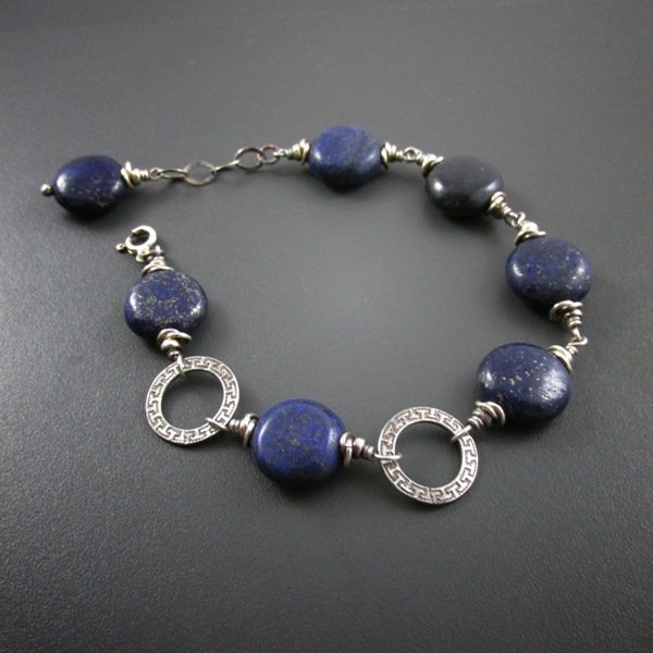 Bransoletka wykonana z monet lapis lazuli 14 mm. Całość dopełniona srebrem 925, oksydowanym i wypolerowanym, w tym ozdobne koła 15 mm. Długość bransoletki wynosi 19,5 cm plus łańcuszek regulacyjny 2 cm. Pasuje na nadgarstek 16,5-17,5 cm. Elegancko zapakowana.