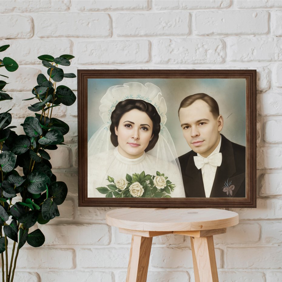 Podaruj personalizowany portret ślubny inspirowany pamiątkami z domów naszych dziadków – unikatowe monidło, które wzruszy, rozbawi i zostanie z obdarowanymi na długie lata.