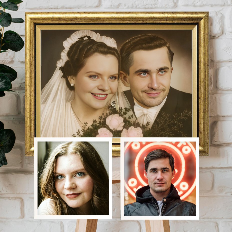 Podaruj personalizowany portret ślubny inspirowany pamiątkami z domów naszych dziadków – unikatowe monidło, które wzruszy, rozbawi i zostanie z obdarowanymi na długie lata.