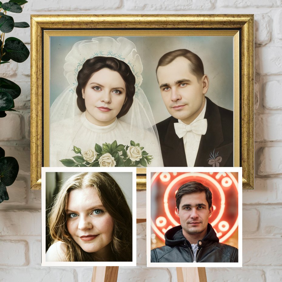 Podaruj personalizowany portret ślubny inspirowany pamiątkami z domów naszych dziadków – unikatowe monidło, które wzruszy, rozbawi i zostanie z obdarowanymi na długie lata.