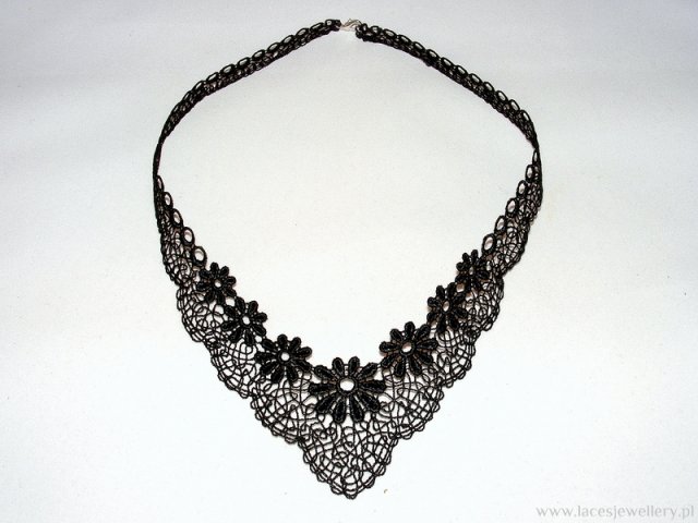 Stylowy i niepowtarzalny naszyjnik. Naszyjnik wykonany z delikatnej koronki w kolorze czarnym. Zapinany jest na łańcuszek. Idealny pasuje do wieczornej sukienki. Nadaje szyku i elegancji a przy tym niepowtarzalności i delikatności.