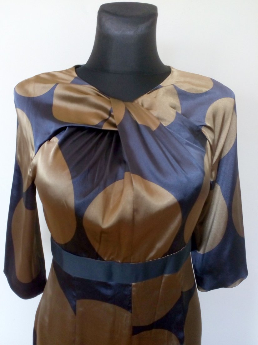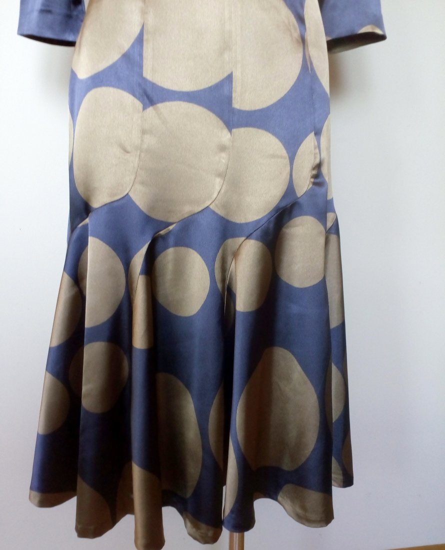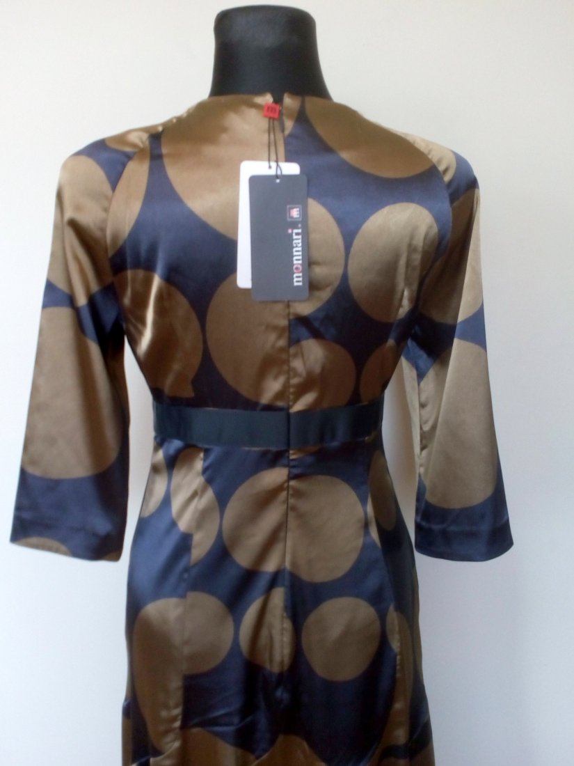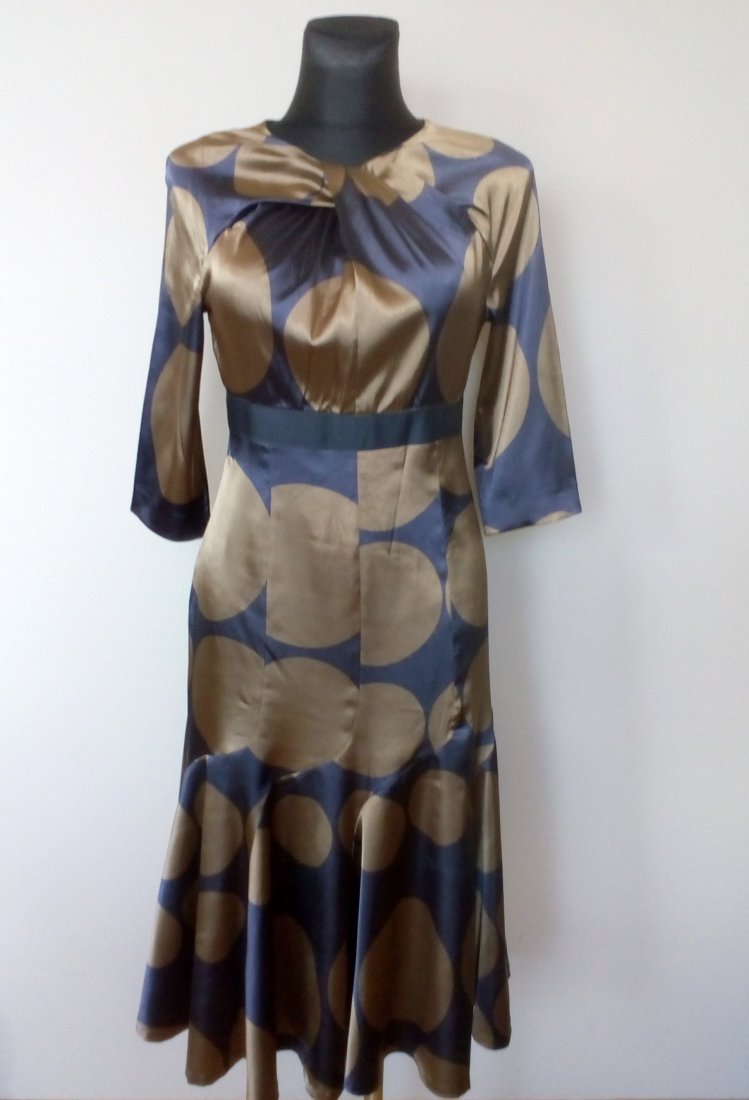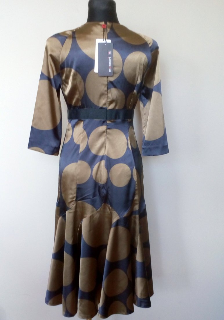 Elegancka nowa sukienka, kolor bazowy grafit ze wzorem w koła w kolorze starego zlota, tkanina satynowa, rekaw raglanowy o dlugości 3/4, odcinana w pasie, rozszerzana do dołu, dół sukienki tworzy koło, zapinana na plecach na dlugi zamek, od wewnątrz podszewka w stalowym kolorze wszyta od pasa do dołu, cena sukienki na metce 469 zł