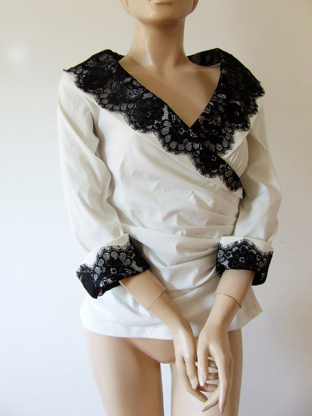Kobieca, dopasowana, elastyczna biała bluzka Monnari, zapinana z tyłu na kryty zamek, z wyłożonym, dużym kołnierzem obszytym czarną koronką. Z boku modnie udrapowana, zakładana góra. Ładnie wymodelowana zaszewkami. Ponadczasowa.