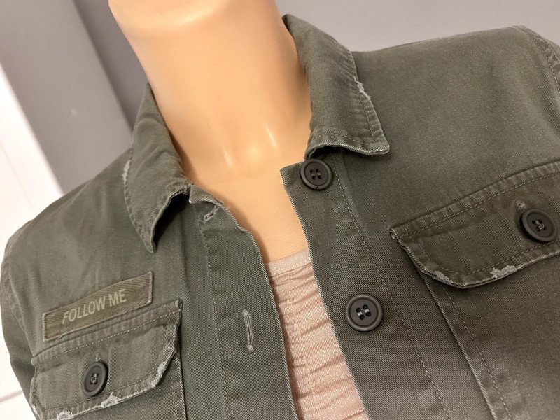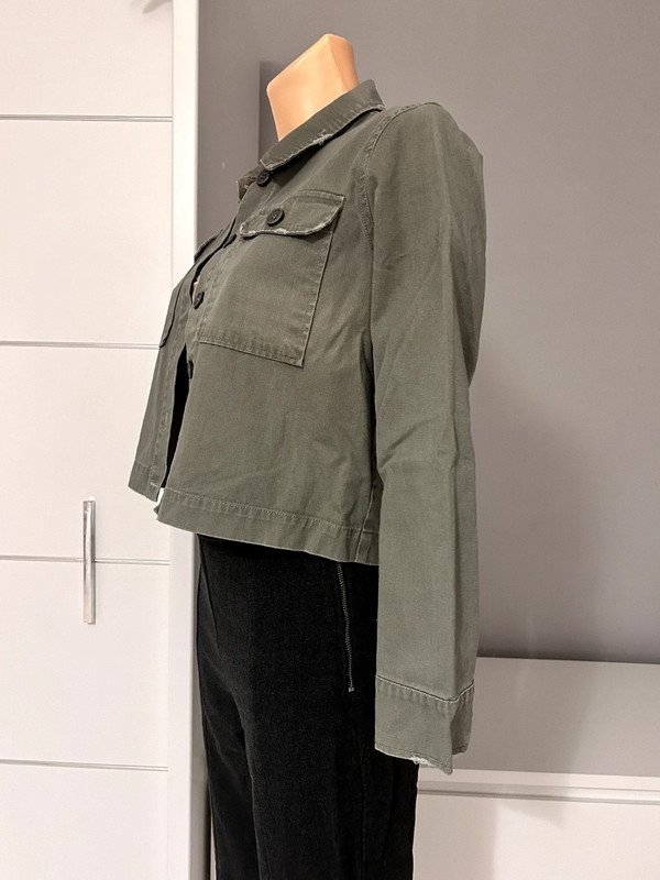 Kurtka marki Mono designed in Denmark, rozmiar z metki to L 40. Jest specjalnie postarzana, posiada kieszenie. Jest krótka, zapinana na guziki. Cena katalogowa to 2500 zł. Wykonana w 100% z bawełny.