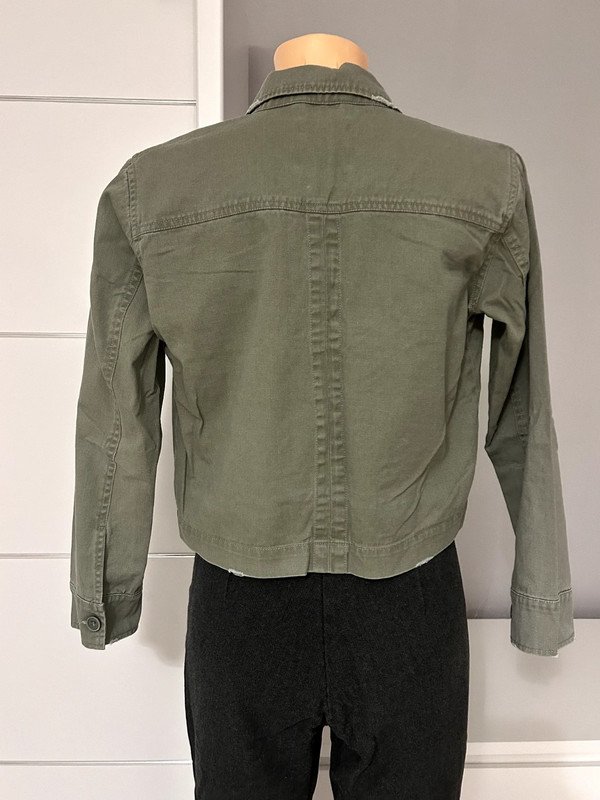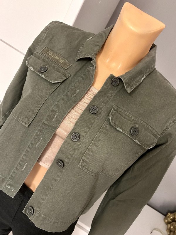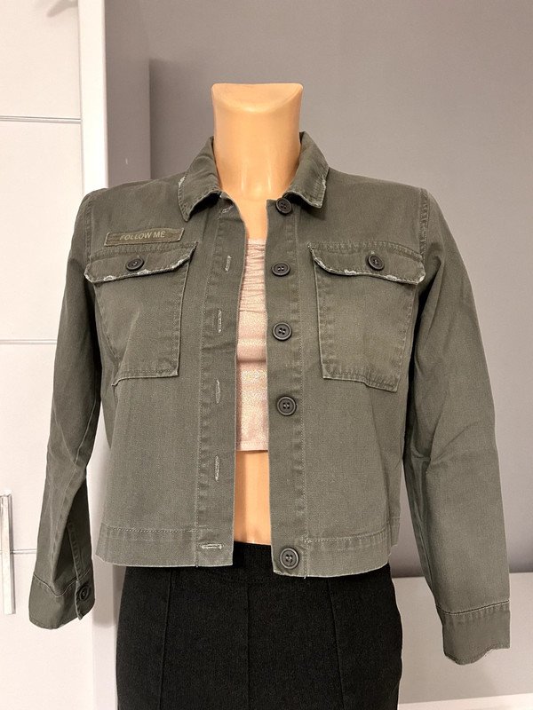 Kurtka marki Mono designed in Denmark, rozmiar z metki to L 40. Jest specjalnie postarzana, posiada kieszenie. Jest krótka, zapinana na guziki. Cena katalogowa to 2500 zł. Wykonana w 100% z bawełny.