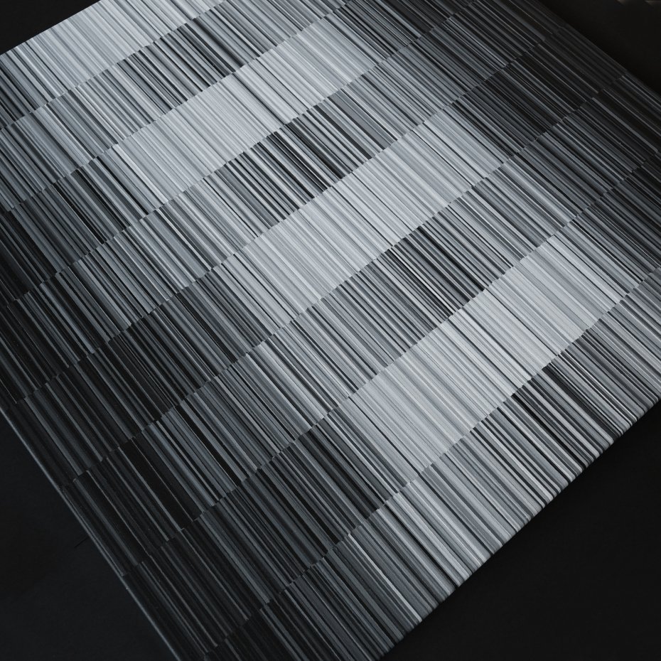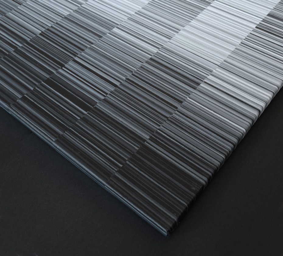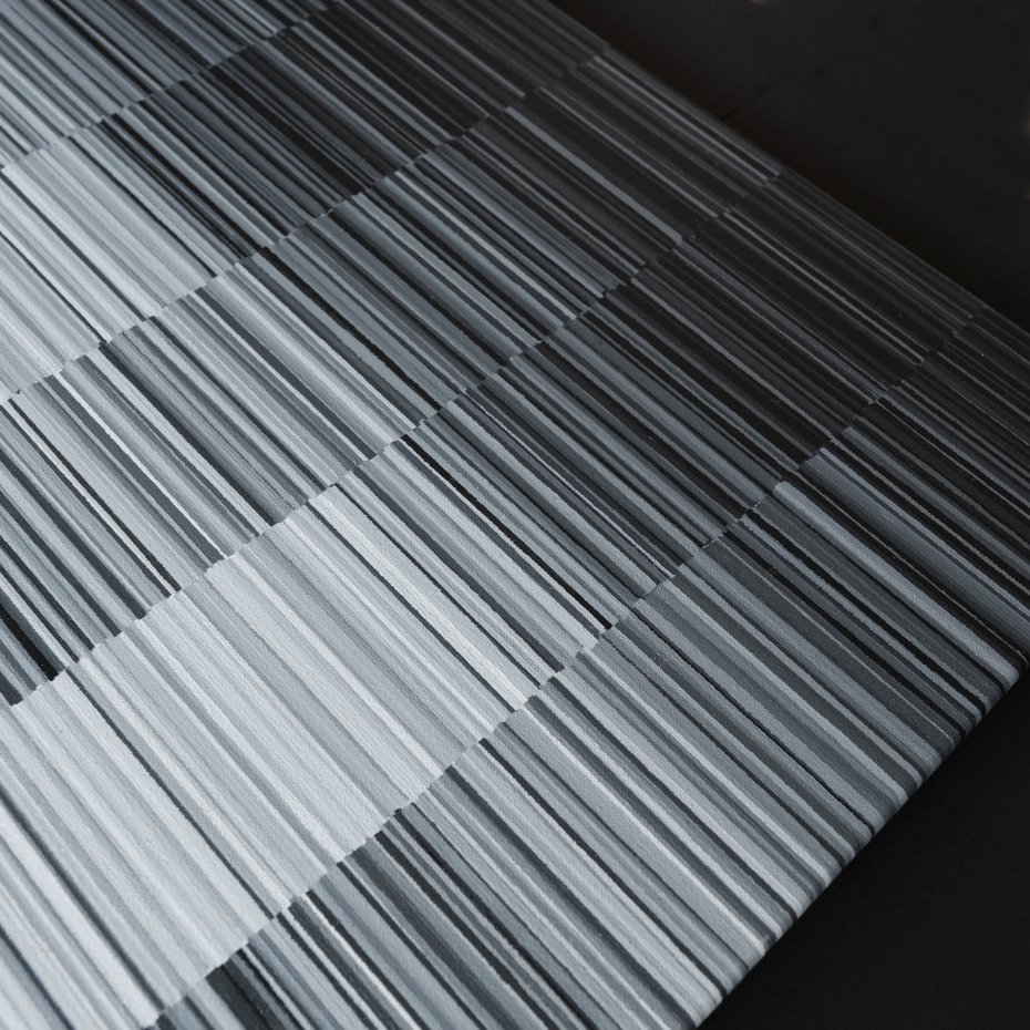 "Monochrome Rhythm" to oryginalny obraz akrylowy na lnianym płótnie, w którym rytmiczny układ pionowych linii tworzy subtelną, graficzną kompozycję utrzymaną w tonacji czerni, szarości i bieli. Praca balansuje pomiędzy precyzją a miękkością, między porządkiem a ruchem — przypomina wizualną partyturę, w której rytm wyznaczają zmieniające się odcienie i faktury.