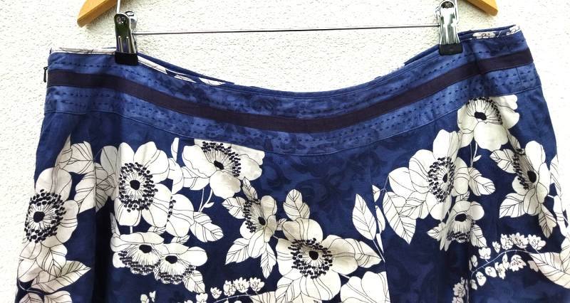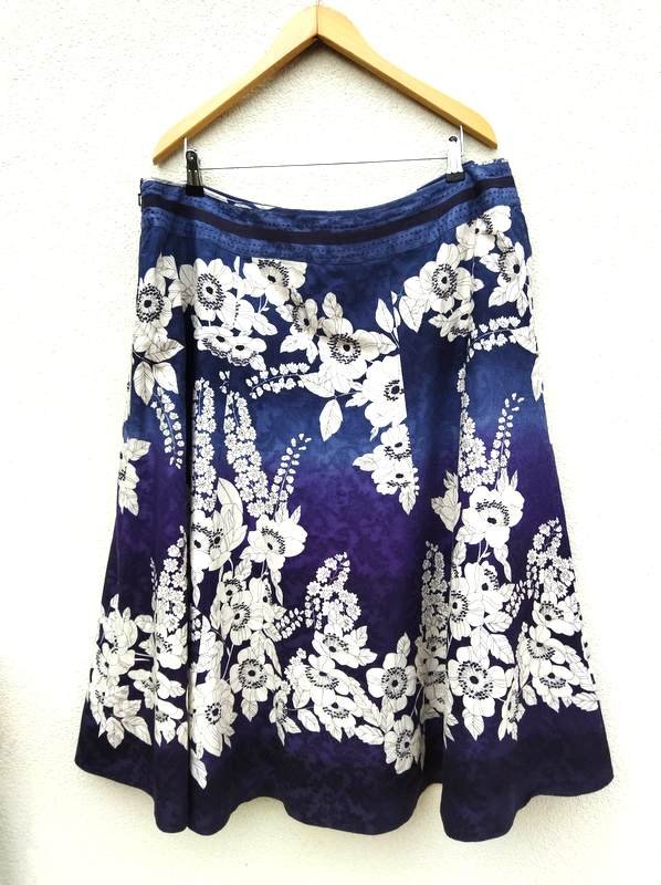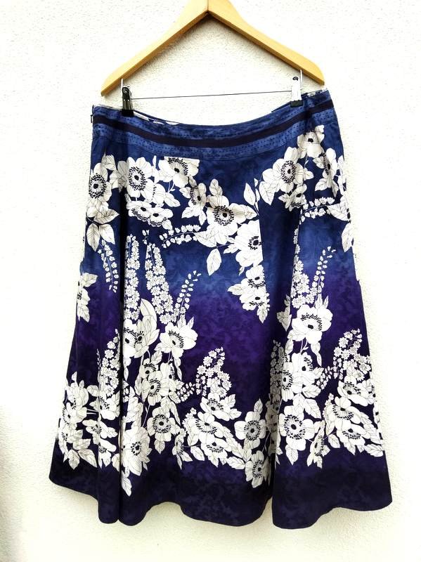 Dobrej jakości spódnica z bawełnianej tkaniny z kwiatowym wzorem w kolorystyce dwóch odcieni granatu, bieli i czerni. Szyta z klinów, zapinana z boku na zamek. Na podszewce