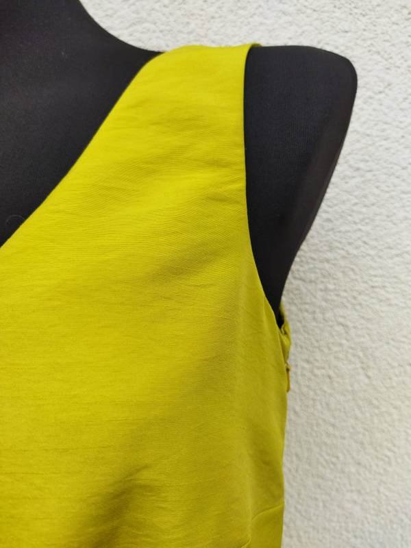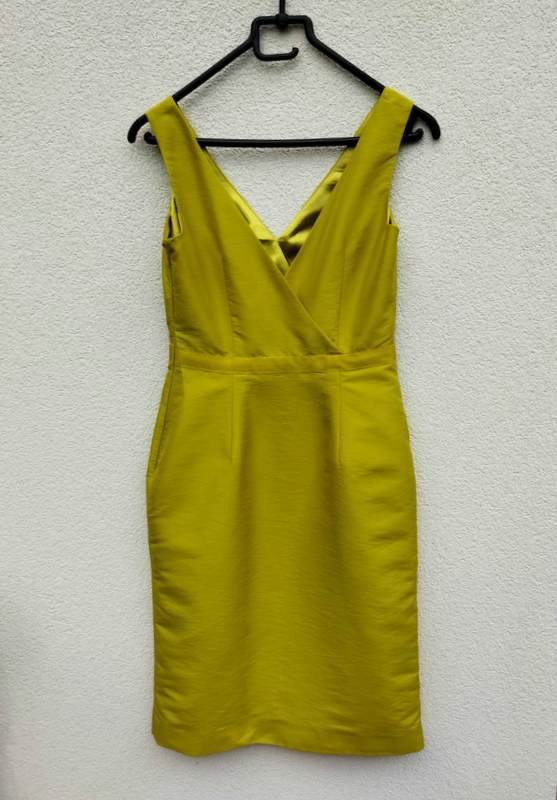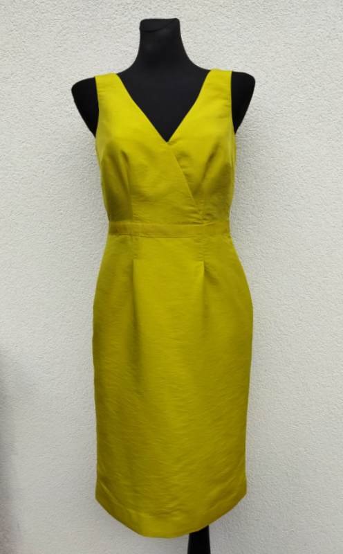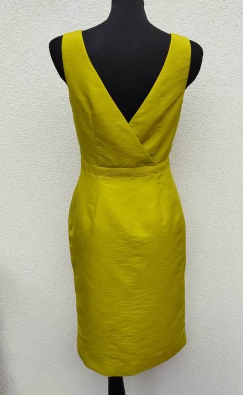 Zgrabna ołówkowa sukienka z poliestrowej tkaniny z dodatkiem nylonu ( z wyglądu przypomina surowy jedwab) w limonkowym kolorze. Odcinana w pasie góra zakładana kopertowo z przodu i z tyłu, z dekoltem w szpic, talia podkreślona naszywanym paskiem z rypsowej taśmy w kolorze sukienki. Zapinana z boku na zamek . całość na podszewce