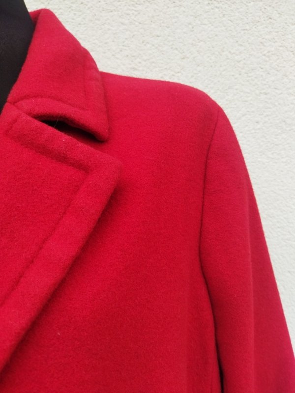 Dobrej jakości płaszcz z wełnianej tkaniny z domieszka, w czerwonym kolorze. Z kołnierzem z rewersami, z dwiema wpuszczanymi kieszeniami z patkami, , z tyłu w pasie patka z guzikami. zapinany na guziki. Całość na podszewce w kolorze płaszcza.