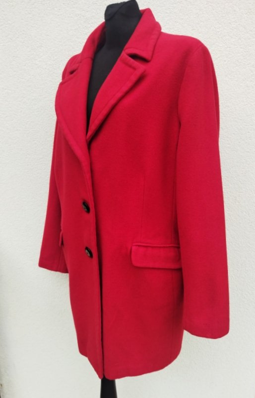 Dobrej jakości płaszcz z wełnianej tkaniny z domieszka, w czerwonym kolorze. Z kołnierzem z rewersami, z dwiema wpuszczanymi kieszeniami z patkami, , z tyłu w pasie patka z guzikami. zapinany na guziki. Całość na podszewce w kolorze płaszcza.