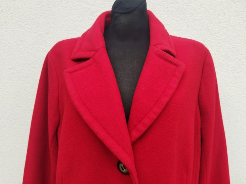Dobrej jakości płaszcz z wełnianej tkaniny z domieszka, w czerwonym kolorze. Z kołnierzem z rewersami, z dwiema wpuszczanymi kieszeniami z patkami, , z tyłu w pasie patka z guzikami. zapinany na guziki. Całość na podszewce w kolorze płaszcza.