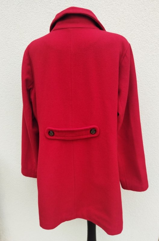 Dobrej jakości płaszcz z wełnianej tkaniny z domieszka, w czerwonym kolorze. Z kołnierzem z rewersami, z dwiema wpuszczanymi kieszeniami z patkami, , z tyłu w pasie patka z guzikami. zapinany na guziki. Całość na podszewce w kolorze płaszcza.