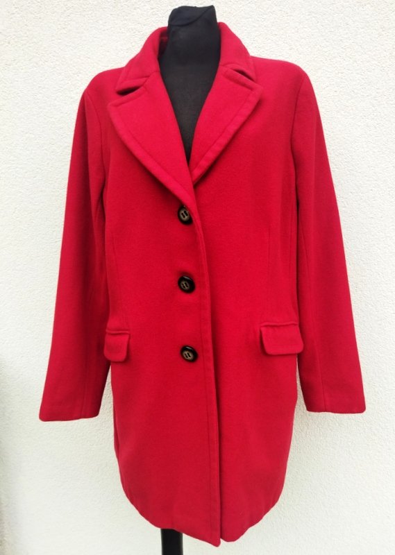 Dobrej jakości płaszcz z wełnianej tkaniny z domieszka, w czerwonym kolorze. Z kołnierzem z rewersami, z dwiema wpuszczanymi kieszeniami z patkami, , z tyłu w pasie patka z guzikami. zapinany na guziki. Całość na podszewce w kolorze płaszcza.