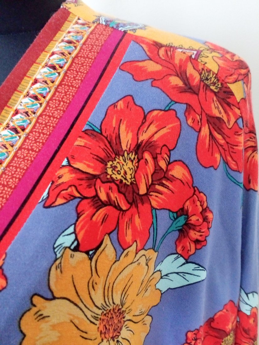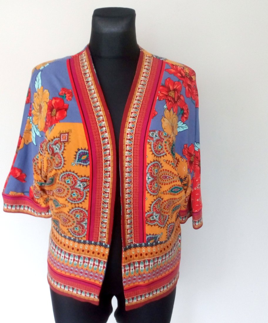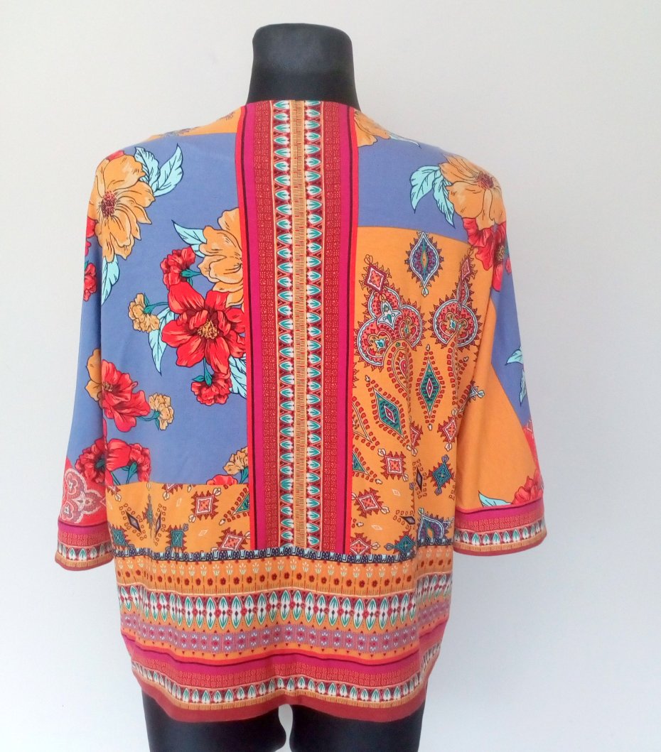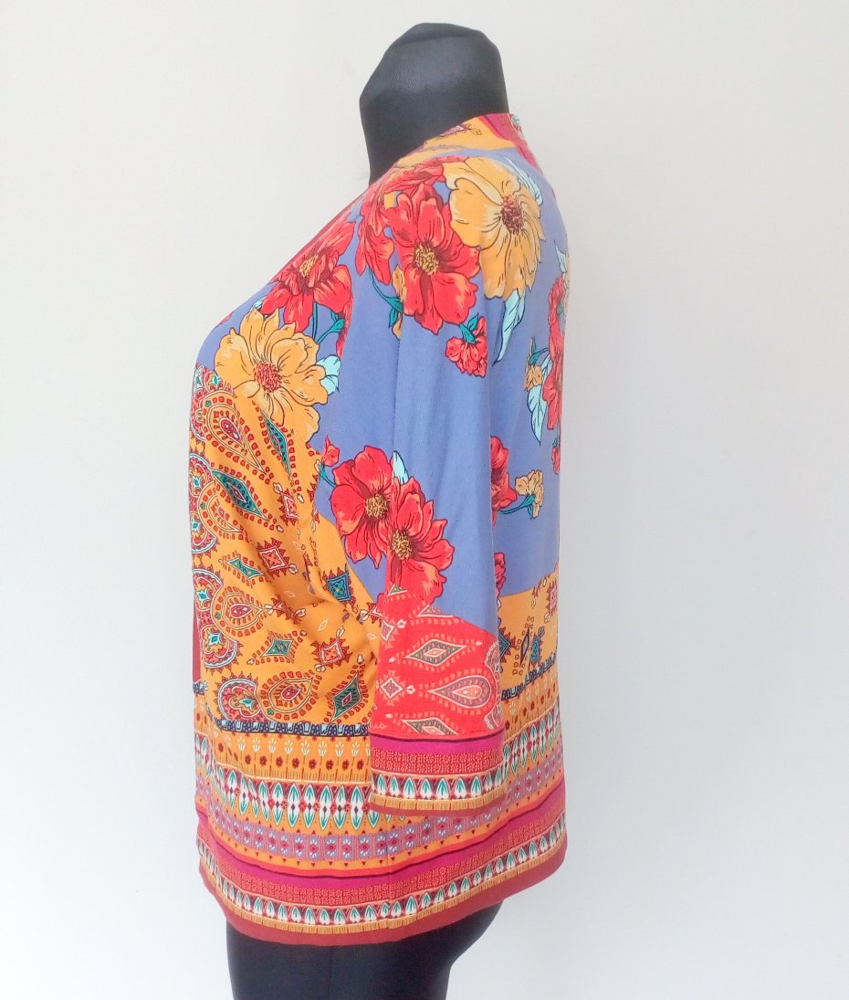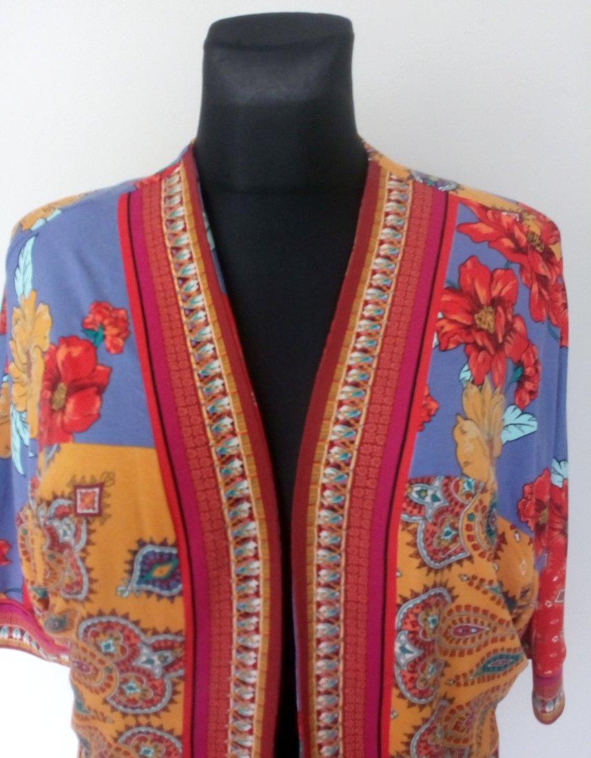 Wzorzysty żakiet z dzianiny jerseyowej, fason bez zapięcia, rękaw o długości 3/4, od środka jerseyowa podszewka w kolorze fioletowego bzu