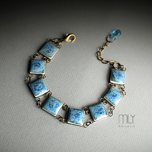 Efektowna bransoletka wykonana z ceramicznych elementów, ręcznie wykonanych z delikatnej śnieżnobiałej porcelany szkliwionych mieszanką błękitnych i zielonych szkliw, elementów metalowych w kolorze mosiężnym Obwód regulowany, wymiary elementu ceramicznego około 10x10mm. Polecam . Termin realizacji zamówienia to 1-2 dni