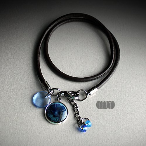 Efektowna bransoletka wykonana z rzemienia jubilerskiego, elementów w kolorze starego srebra i ręcznie wykonanej ceramicznej zawieszki, szkliwionej mieszanką błękitnych szkliw z efektem plamek o subtelnym połysku, Obwód regulowany. Polecam