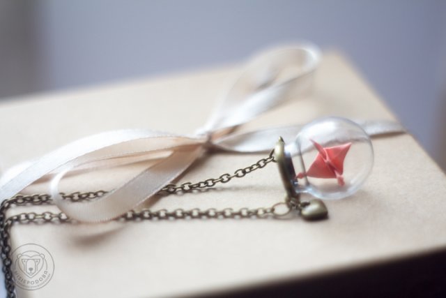 Delikatny, maleńki, papierowy żuraw - japoński symbol szczęścia, zdrowia i pokoju. Podobno, jeśli w jakiejś intencji złoży się tysiąc żurawich figurek, to życzenie się spełni. My spełniamy życzenia tym zjawiskowym wisiorkiem. Papierowy żuraw ukryty w szklanej kuleczce o najszerszej średnicy 2 cm. Część ozdobna zawieszona na łańcuszku o długości 37 cm. Całość w kolorze starego złota/brązu.