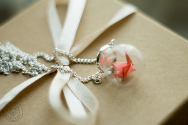 Delikatny, maleńki, papierowy żuraw - japoński symbol szczęścia, zdrowia i pokoju. Podobno, jeśli w jakiejś intencji złoży się tysiąc żurawich figurek, to życzenie się spełni. My spełniamy życzenia tym zjawiskowym wisiorkiem. Papierowy żuraw ukryty w szklanej kuleczce o najszerszej średnicy 2 cm. Część ozdobna zawieszona na łańcuszku o długości 37 cm. Całość w kolorze srebra.