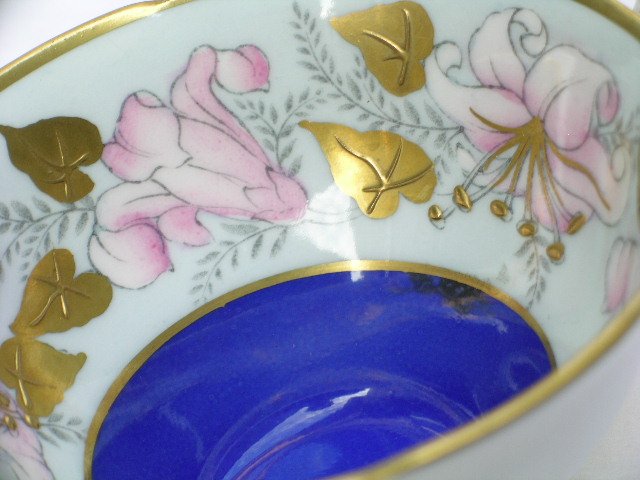 Wyjątkowo piękna, pojedyncza jak na razie filiżanka porcelanowa, sygnowana, angielska. Starej daty i bardzo elegancko zdobiona - róż, głęboki i żywy kobalto-granat i fakturowe, ręcznie malowane złocenia. Piękna klasyczna forma, falbanowanie brzegu, spokój czystej bieli od zewnątrz. Zjawiskowa i z duszą :) Dół 4,5; góra 10; szer. 12,5; wys. 6 cm. Stan zachowania bardzo dobry.