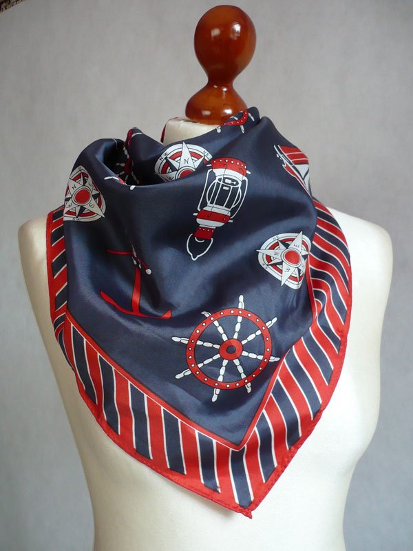 Chustka vintage w motywy morskie:granatowo-czerwono-biała.