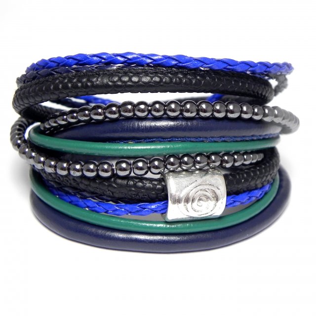 Efektowna bransoletka mojego autorstwa, z serii 2w1, dla wielbicielek i kamieni, i rzemyków, przeznaczona do dwukrotnego owinięcia wokół nadgarstka, wykonana została tylko w JEDNYM EGZEMPLARZU, z rzemieni ze skóry ekologicznej i naturalnej, sznura kuleczek hematytu (4 mm) oraz elementów metalowych w kolorze srebrnym. Będzie odpowiednia na nadgarstek 16 cm.