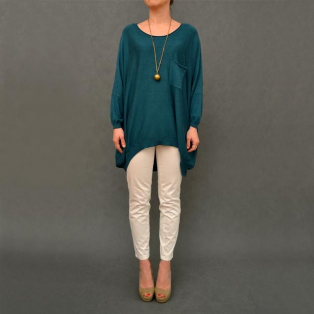 Sweterkowa bluzeczka oversize w morskim kolorze. Tył dłuższy.
