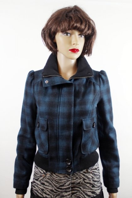 Kurtka marki New Look w rozmiarze 36.Kolor bardzo ciekawy ciemno-morski w kratkę . Kurtka zapinana na na metalowe zatrzaski i ekspres. Z przodu efektowne kieszenie. Gruby ściągacz na dole i na zakończeniach rękawów. Kurtka na podszewce.Efektowne rękawki przymarszczane pufki. Ciepła stójka Materiał grubszy o składzie: 54% wełna, 26% poliester, 7% akryl, 4% nylon, 2% bawełna. Stan bardzo dobry z dużym plusem.