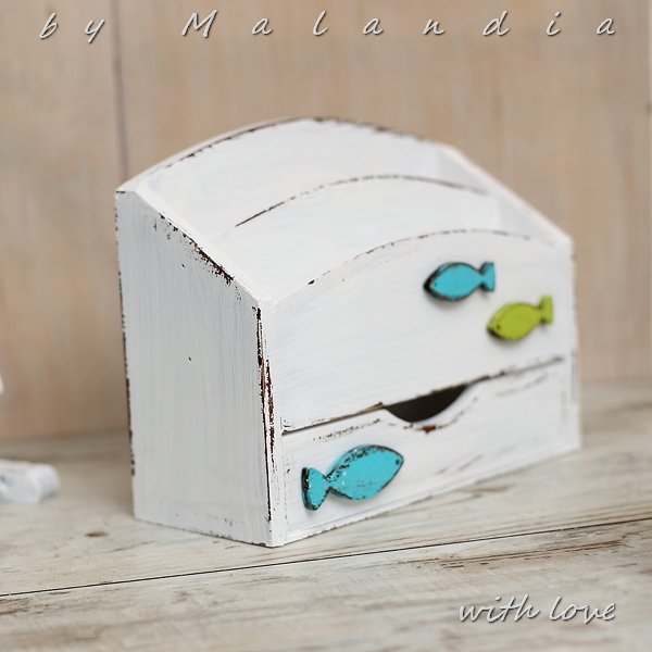 Listownik wykonany z drewna, pomalowany metoda shabby chic, ozdobiony rybkami, posiada wysuwaną szufladkę.