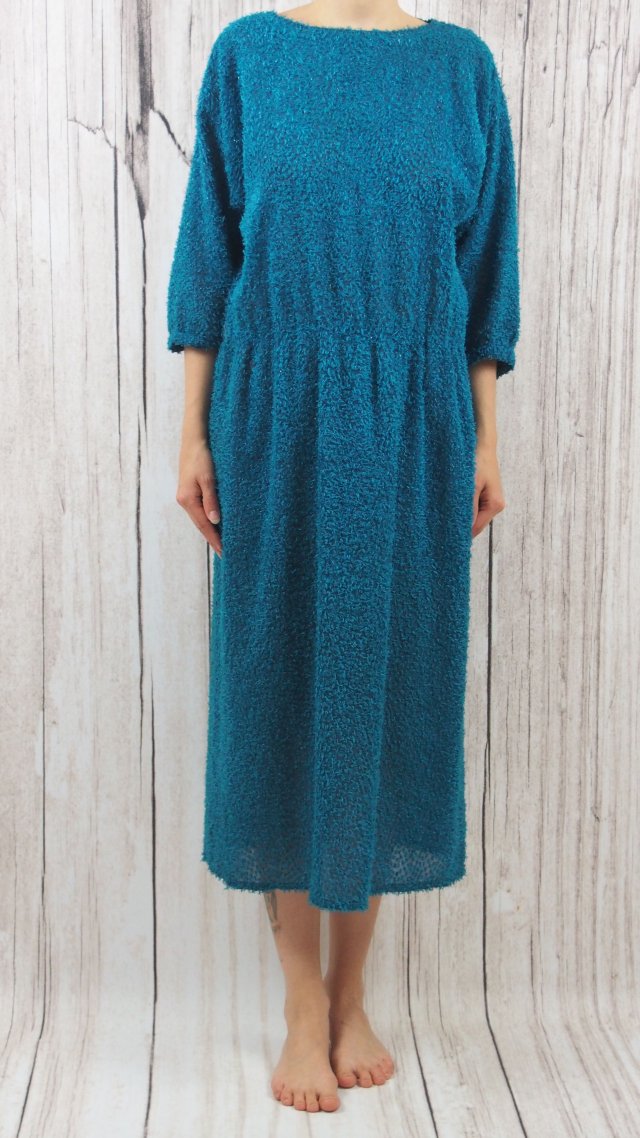 Sukienka z dawnych lat o wyjątkowo kobiecym kroju. Materiał to moim zdaniem żorżeta obszyta niteczkami. Super wygląda w połączeniu z trampkami, martensami innymi traperami, albo mniej rockowo, a bardziej dziewczęco z balerinkami.