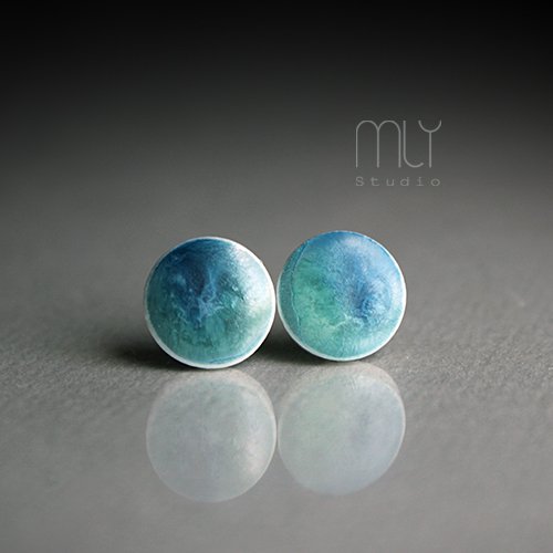Ceramiczne okrągłe kolczyki, ręcznie wykonane z pięknej, śnieżnobiałej porcelany, jednostronnie szkliwione błękitno zielonym szkliwem z efektem plamek , na antyalergicznych sztyftach w kolorze srebrnym. Średnica ok. 9mm. Polecam