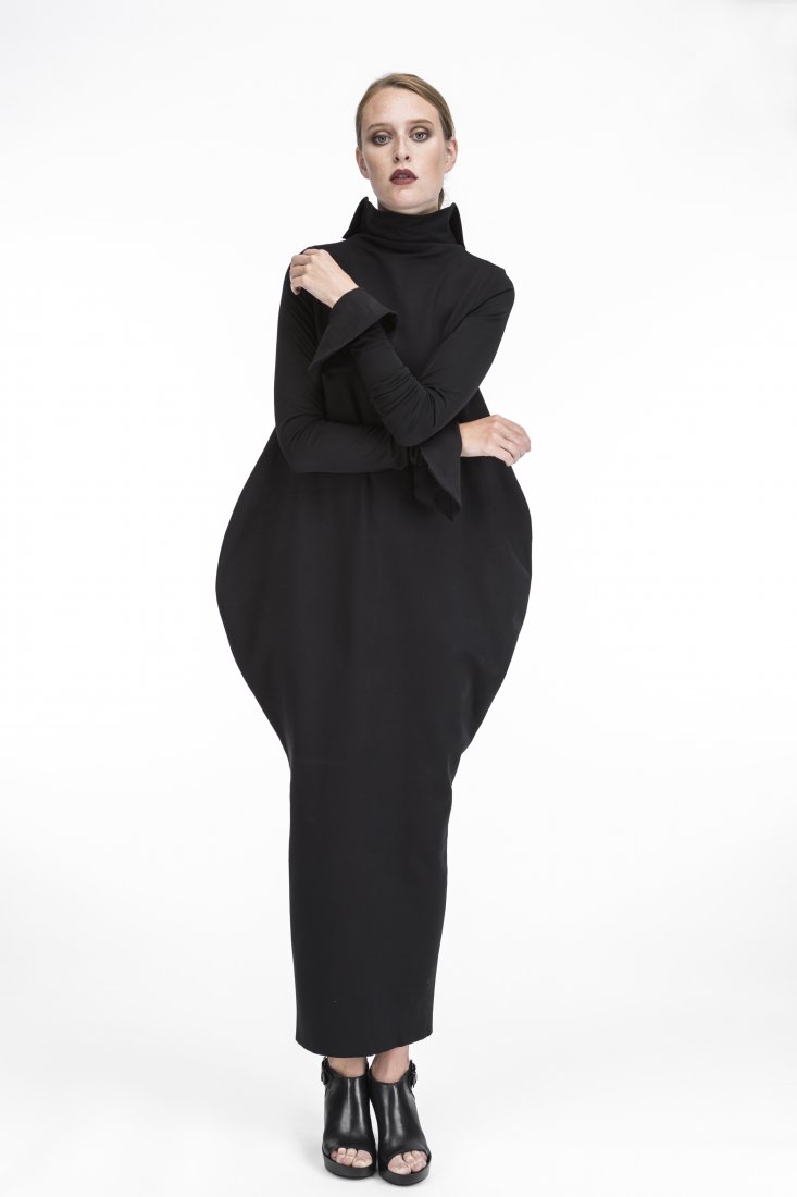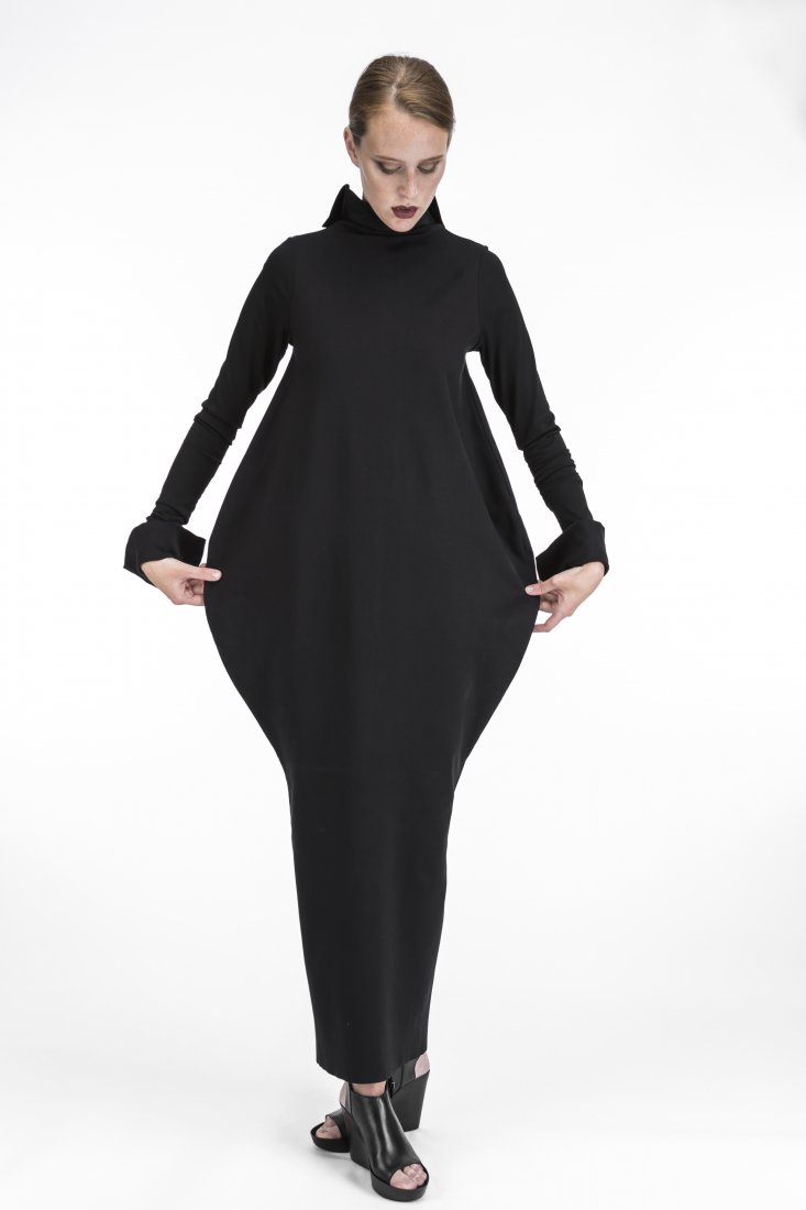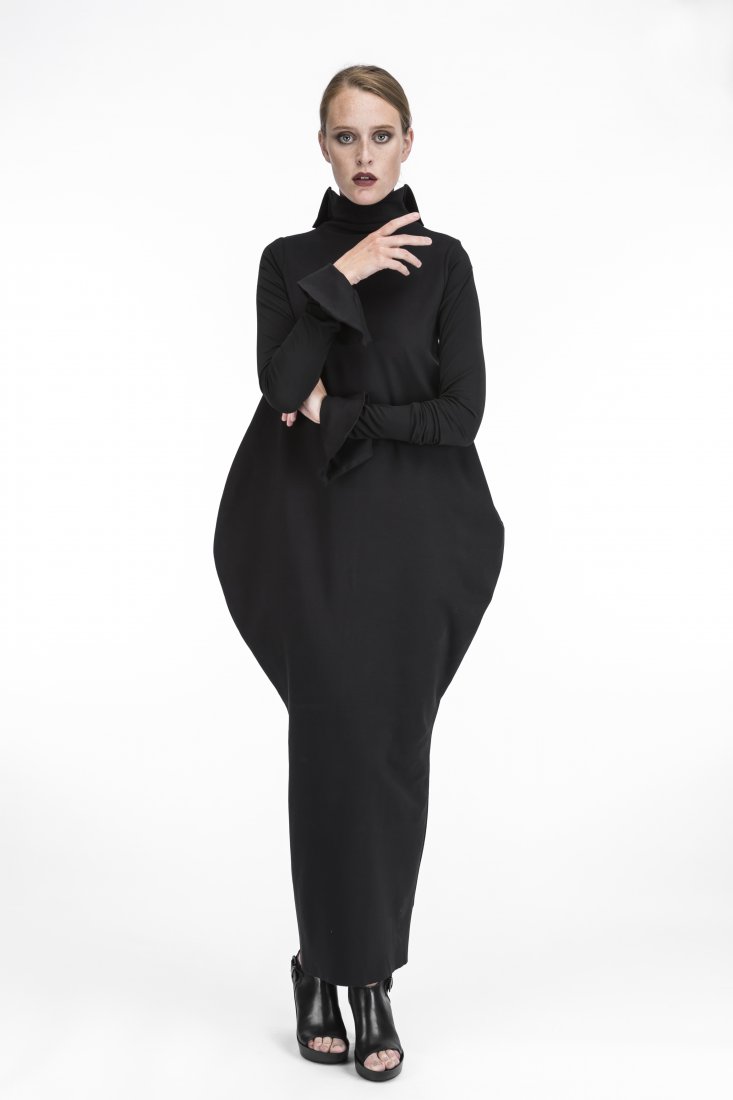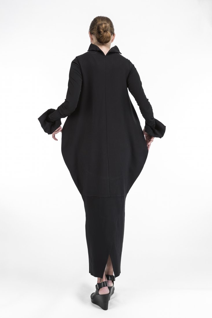 Klimatyczna sukiena uszyta z grubszej dzianiny /wiskoza, nylon, elastan/ z ozdobnymi luźnymi mankietami, z przodu mały golf schodzący do tyłu w mały kołnierz, rękawy z cieńszej dzianiny, poszerzona ku biodrom, mocno zwężona ku dołowi, z tyłu u dołu odszycie klinowe dla swobody poruszania się,