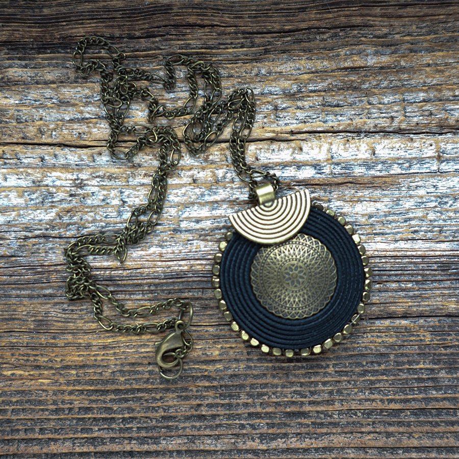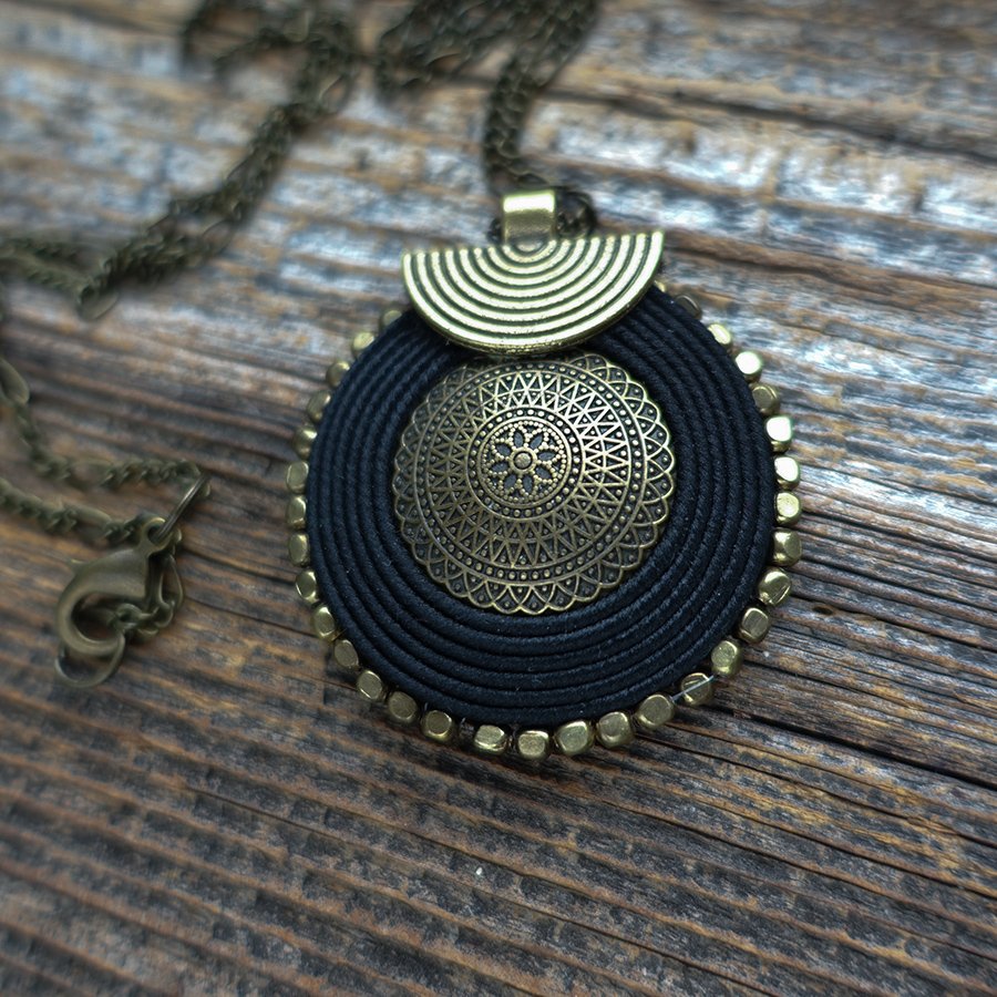 Materiały: guzik w kolorze mosiądzu, sznurki sutasz, metalowe koraliki w kolorze mosiądzu, etniczna ozdoba;