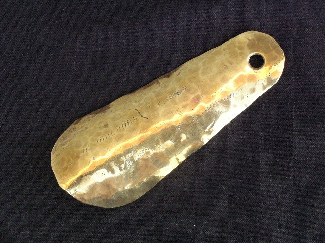 Ręcznie wykonana, w miarę lekka, mosiężna łyżka do butów. Przyjemnie nieregularna, z przydającymi charakteru śladami lubego użytkowania, z młotkowanym efektem i dziurką do powieszenia. 12 x 4,5 x 1,5 cm. Stan zachowania mosiężnie autentyczny :)