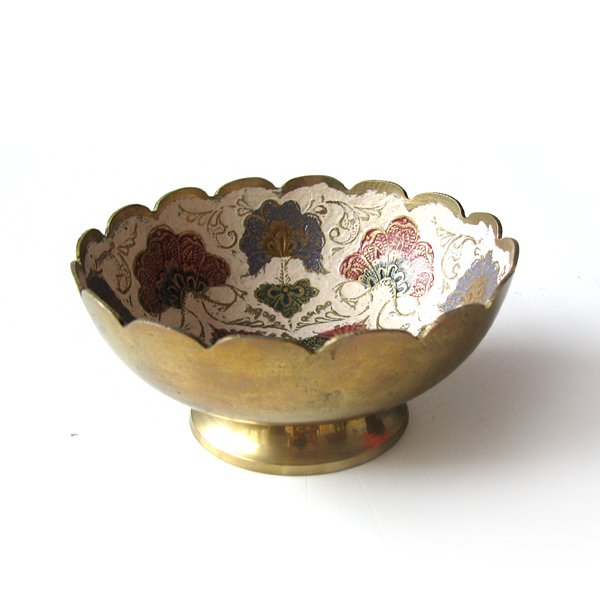 Przepiękna mała, mosiężna miseczka, pokryta wewnątrz kolorowym laminatem, ze ślicznym wzorkiem. Idealna na drobiazgi, słodycze