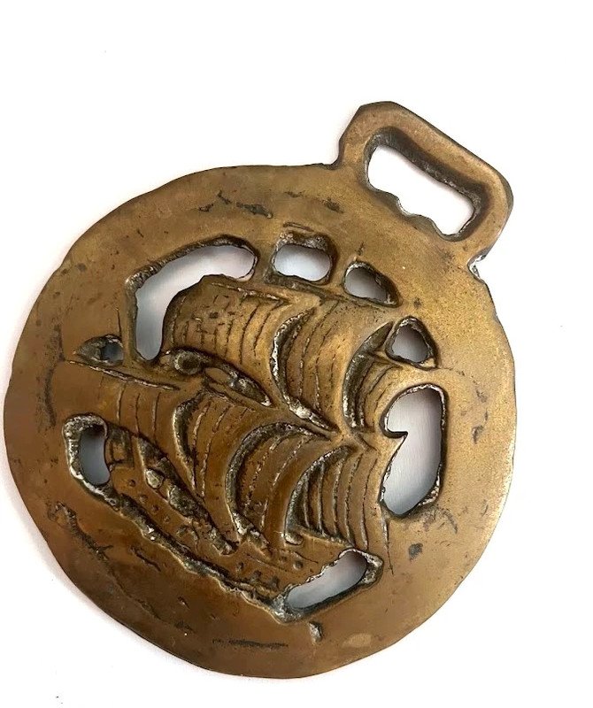 Mosiężna zawieszka dekoracyjna z motywem żaglowca, w stylu marynistycznym. Piękny, ażurowy wzór, solidne wykonanie i naturalna patyna podkreślająca wiek przedmiotu.