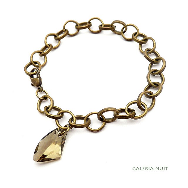 Bransoletka wykonana z mosiężnego łańcuszka o dużych ogniwach 8x9 mm ozdobiona zawieszką z kryształka Swarovski o szlifie Galactic Vertical w kolorze Jonquil wielkości 19 mm. Długość bransoletki jest regulowana i wynosi maksymalnie 21 cm