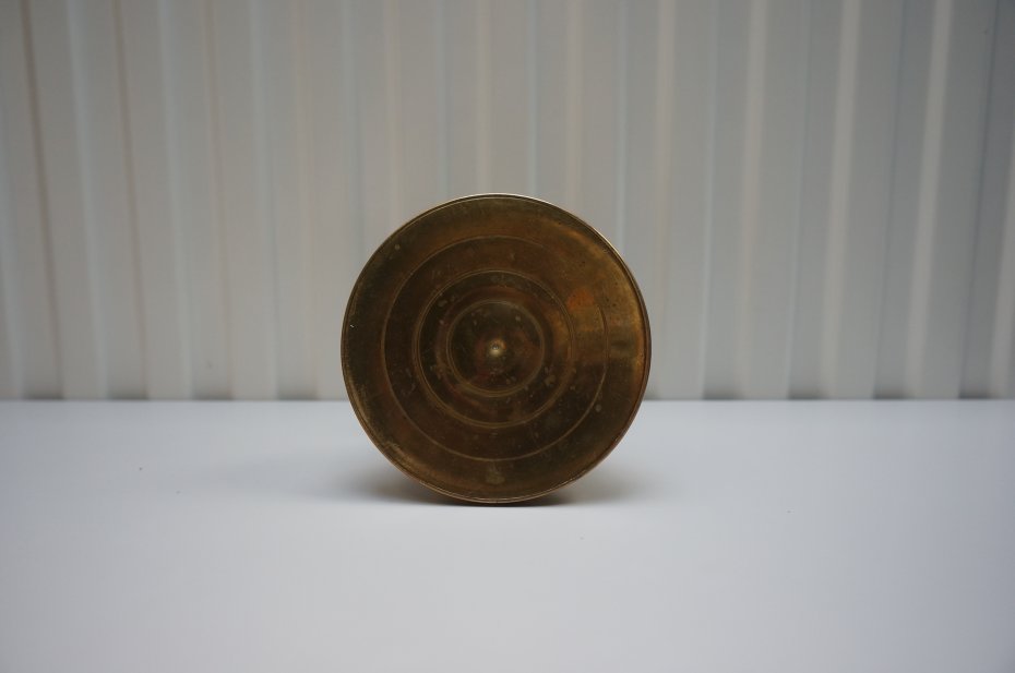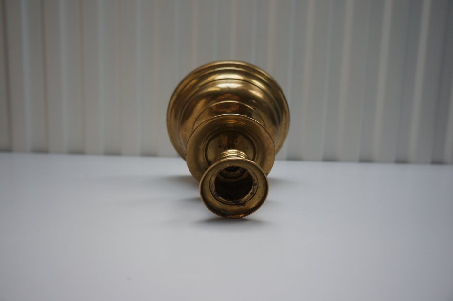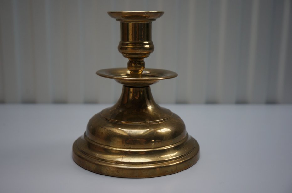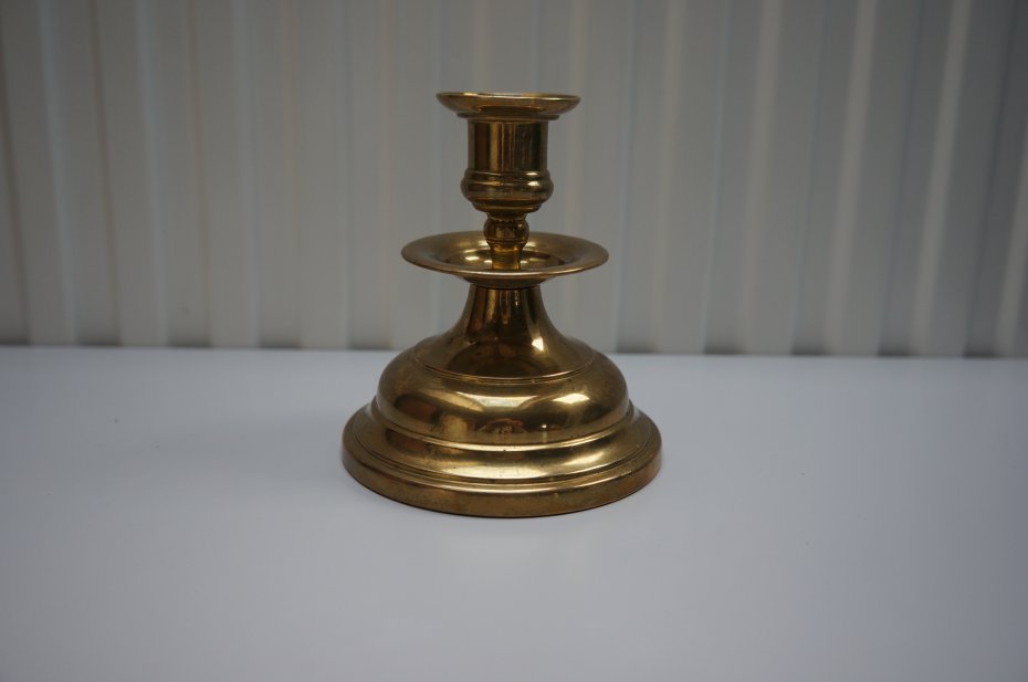 Mosiężny świecznik w stylu barokowym, często określany mianem “dzwonkowego" ze względu na kształt podstawy. Ciężki, stabilny. Stan vintage.