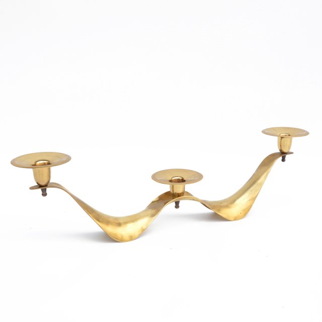 Modernistyczny świecznik wykonany z mosiądzu we Francji w drugiej połowie XX wieku. Przedmiot wyróżnia się ze względu na oryginalną formę. Korpus w formie falistej wstęgi z ciekawą strukturą wężowej skóry, na której umocowane zostały trzy profitki. Przestrzenna bryła i uproszczona, minimalistyczna forma oparta na elementach konstrukcyjnych jest charakterystyczna dla modernizmu. Prąd ten stał w opozycji do bogatych ornamentów eklektyzmu i secesji. Charakteryzowało go nowoczesne dążenie do syntetycznego ujmowania form oraz ich geometryzacji. Piękna poszukiwano wówczas głównie w funkcji przedmiotu użytkowego. Stan zachowania przedmiotu oceniamy na bardzo dobry, nosi normalne ślady użytkowania.