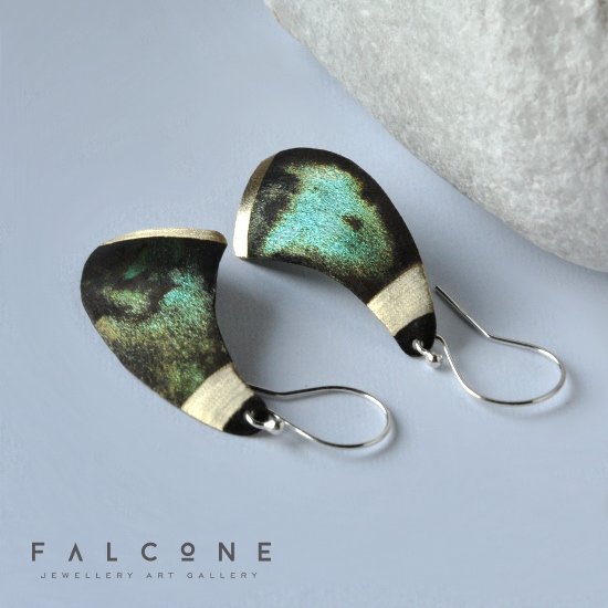 Koczyki nawiązujące kształtem do motylich skrzydeł. Unikalne wybarwienie i nieco surowa faktura, czynią z nich nietuzinkowy dodatek. Ozdobne akcenty w kolorze złota dodają im elegancji. Bigle z jasnego srebra 925. Długość kolczyków to ok. 4 cm.