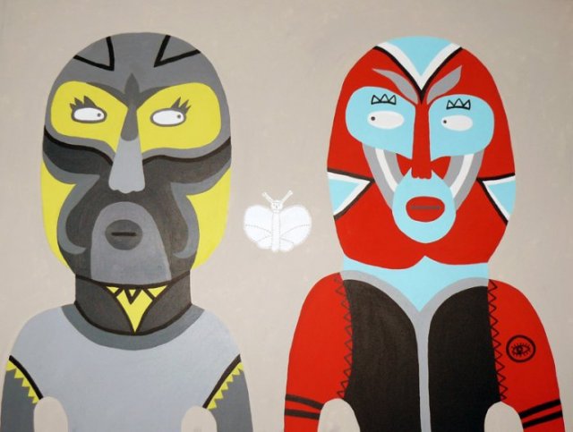 Praca oryginalna, duże kontrasty kolorystyczne, inspiracją były postacie meksykańskich luchadores.