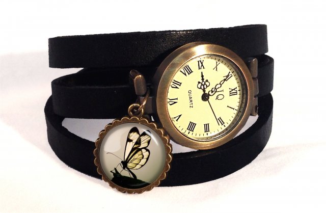 Zegarek ze skórzanym paskiem kilkakrotnie zakręcanym na ręku z ręcznie robioną zawieszką (kaboszonem).