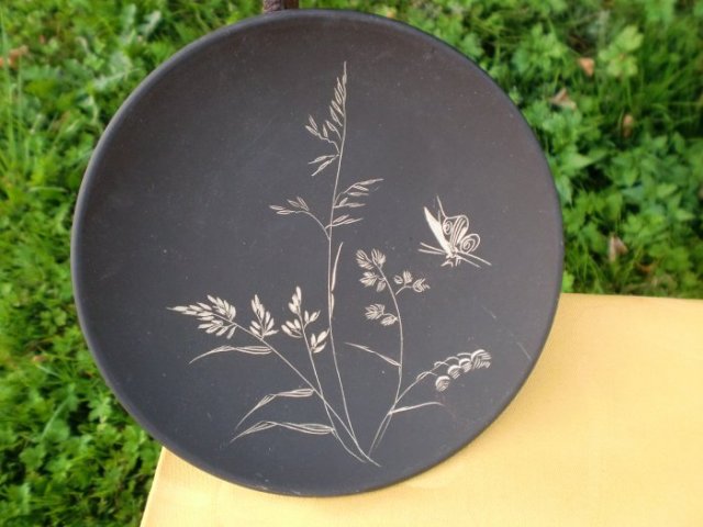 Ceramiczny talerzyk ozdobny do powieszenia. Ręcznie robiony z gliny w kolorze gorzkiej czekolady i wypalany na surowo bez szkliwienia matowy. Zdobiony finezyjnymi kwitnącymi trawami i motylem. Wyjątkowo klimatyczny, artystyczny.