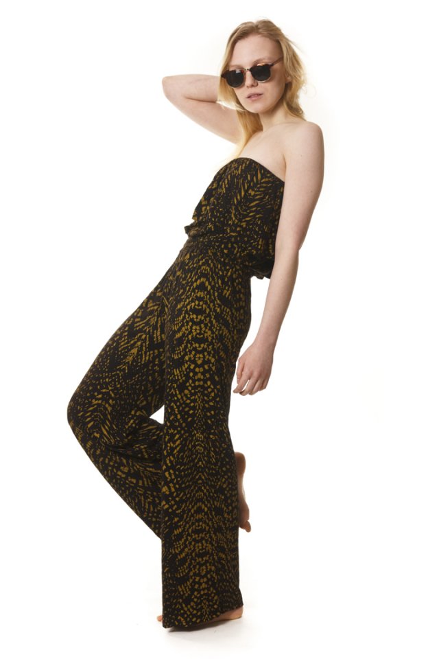 Elastyczny kombinezon z szerokimi nogawkami, elastycznym pasem i dużą ala falbanką na przodzie. Dzięki elastycznej gumce u góry, kombinezon się dobrze trzyma i nie osuwa.