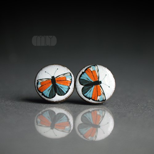 Ceramiczne okrągłe kolczyki, ręcznie wykonane z delikatnej gliny kamionkowej, jednostronnie szkliwione mieszanką białych, błękitnych i pomarańczowych szkliw z efektem plamek, dekorowane autorska kalką ceramiczną,na antyalergicznych sztyftach w kolorze srebrnym. Średnica ok. 11mm. Polecam . Termin realizacji zamówienia to 1-2 dni.