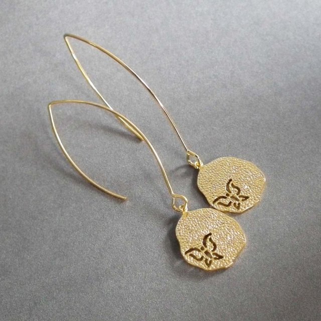 Piękne kolczyki wiszące, pokryte 16 karatowym matowym złotem. Subtelne, ażurowe zawieszki z wyciętymi motylkami na pozłacanych, eleganckich dużych biglach.