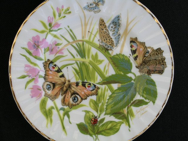Przyjemnie lekki i jedwabisty w dotyku porcelanowy talerzyk śniadaniowy z poetycką malaturą motylo-ogrodową. Pasami ryflowany na szerokim obrzeżu, na rancie złocony. Sygnowany, angielski. 16,5 x 1,5 cm. Użytkowy :) Stan zachowania bardzo dobry.