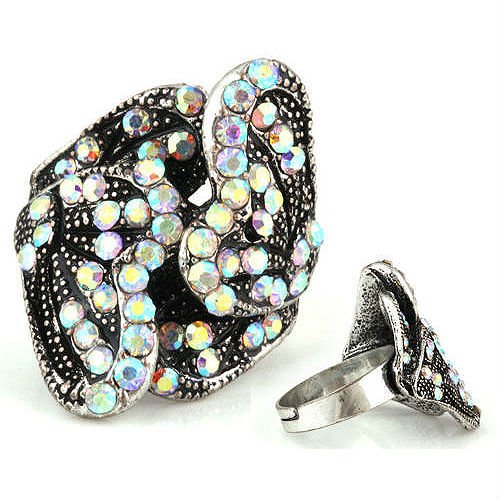 Pierścionek niczym zamknięte skrzydła motyla . Wykonany z metalu w kolorze ciemnego srebra, zdobiony mieniącymi się kryształkami.